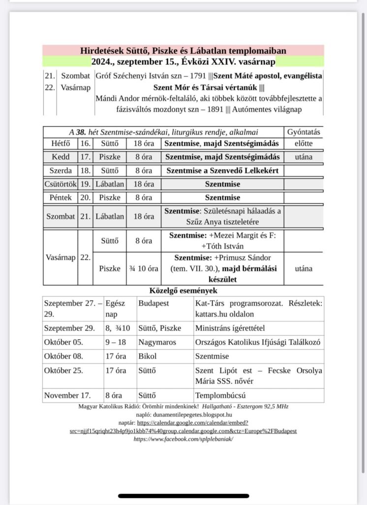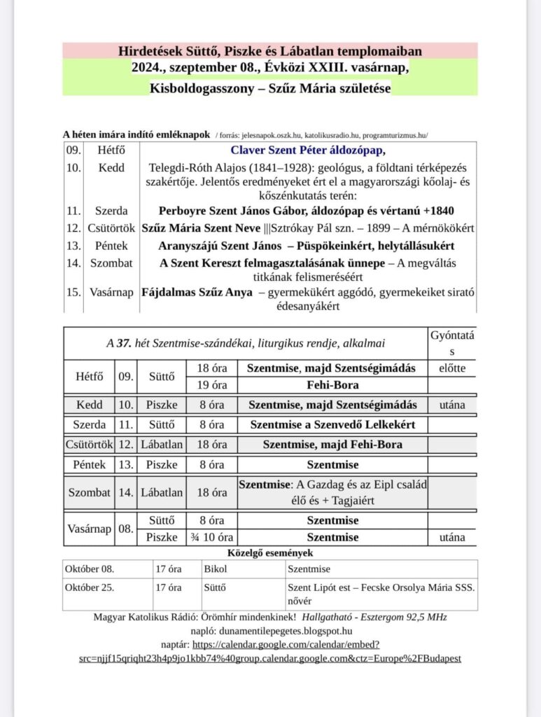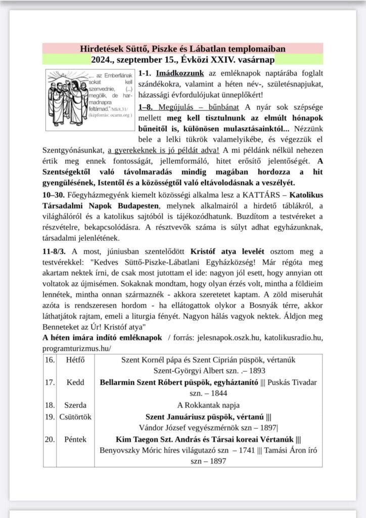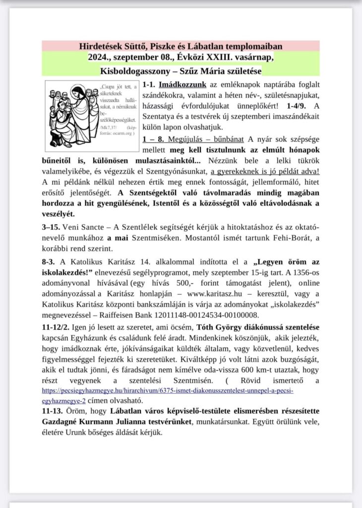 2024.09.15., Évközi XXIV. vasárnap 2024.09.08., Évközi XXIII. vasárnap, Kisboldogasszony – Szűz Mária születése